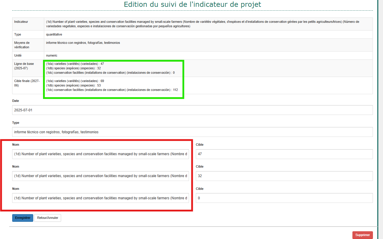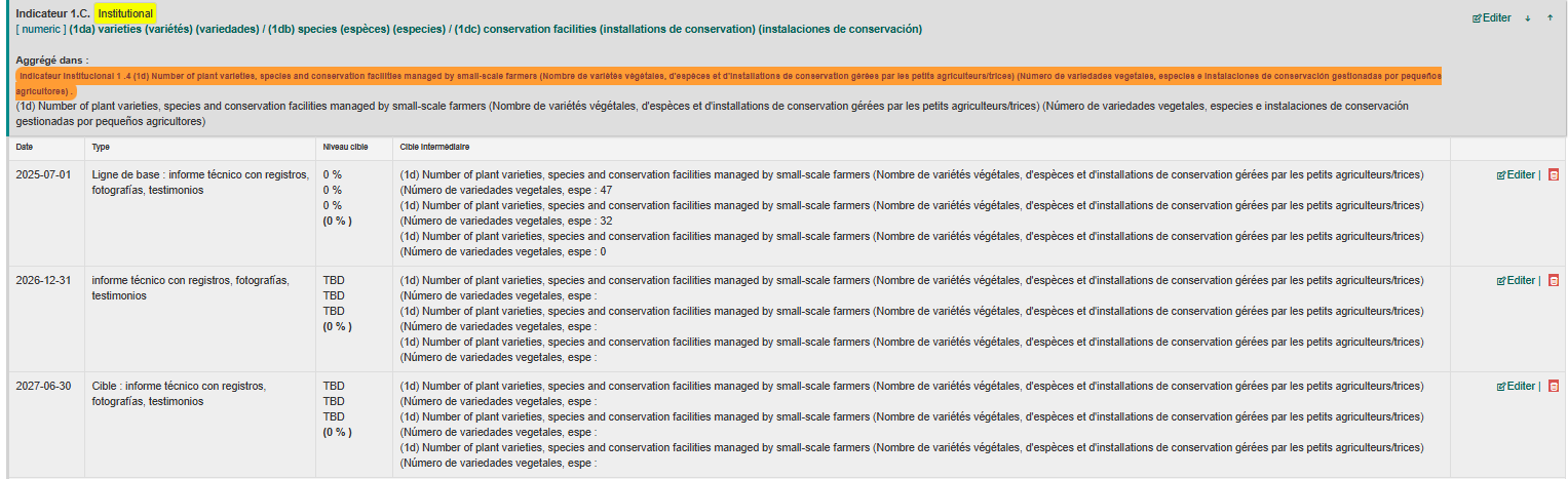 Au moment, par exemple l'indicateur globale 1d n'est pas affiché correctement dans la vue d'ensemble d'un project (eg. 1.C du projet "Paz y Buen Vivir en Arroyo Pichilín"). Les cibles intermédiaire sont toujours trois fois 1d,au lieu de 1da, 1db, 1dc. Même chose si on veut editer les cibles intermédiaires. En haut dans le tableau sous Edition cest correcte (vert).